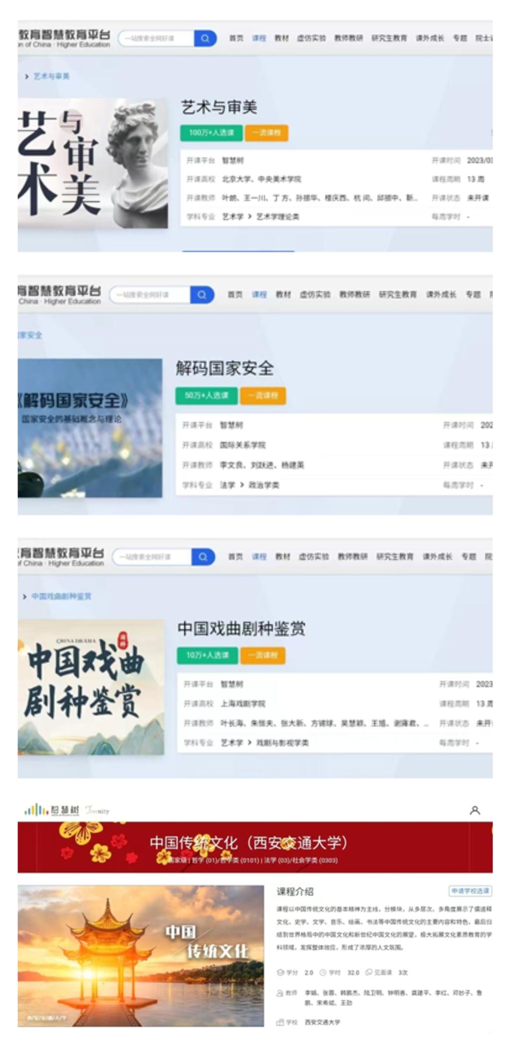 我校此次通識教育課程改革,既豐富了傳統意義上的教育教學資源,也緊跟信息化發展趨勢,持續加強數字化優質特色資源共享。學校有效利用國家智慧教育平臺上的教學資源,擴大線上優質資源的覆蓋面和服務效用,推動學校教育信息化、現代化、網格化,帶動信息化時代藝術院校教育教學各環節的改革提升。