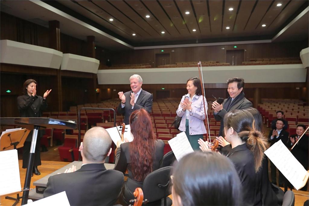 隨后,波利希一行來到音樂廳,與我校青年交響樂團進行交流。管弦系副主任宋強代表全系師生致歡迎辭,高嵩老師指揮樂團演奏了作曲家關峽創作的《第一交響序曲》。在欣賞完演奏后,波利希院長、何為院長與同學們進行了互動交流。波利希院長對樂團師生們的表演藝術水準給予高度認可,并表示在過去的十幾年里,天津音樂學院一直是最親密的朋友與合作伙伴,歡迎越來越多的老師和同學們到天津茱莉亞學院交流。
