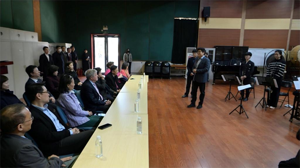 波利希一行首先來到我校民樂系實驗劇場,觀摩了民族室內樂課程。民樂系主任陳軍向大家生動介紹了民族音樂的創作和表演特點,而后9名同學在朱敏老師的指揮下,演奏了我國當代青年作曲家李博禪創作的民族室內樂作品《茶馬》。波利希院長聆聽后感嘆中國民族音樂的深刻表現力,并就演奏曲目的創作、節拍等問題與師生進行探討。他表示,通過藝術的交流與對話,中西方音樂一定會更完美地融合在一起并推向世界。