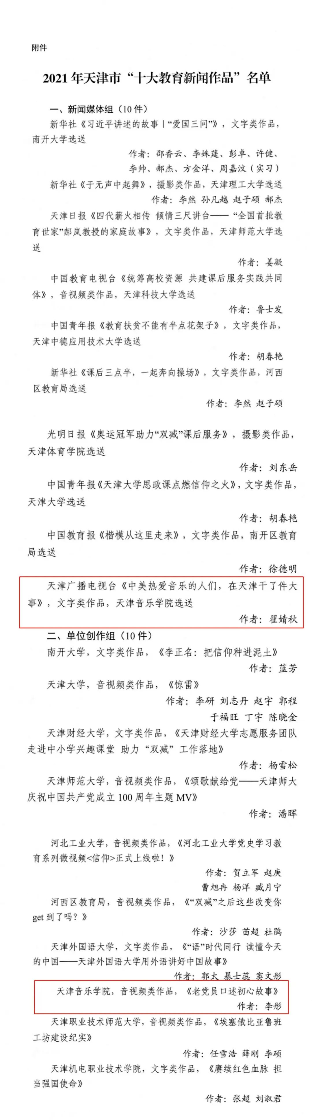 本站訊(編輯 李彤 責任編輯 趙霞)日前,由市教育兩委組織開展的2021年天津市“十大教育新聞作品”評選結果公布。經過自主申報、專家評審、網上公示,最終評選出新聞媒體組、單位創作組各10件作品。其中,我院報送的兩部新聞作品《中美熱愛音樂的人們,在天津干了件大事》《老黨員口述初心故事》分別入選新聞媒體組、單位創作組獲獎作品名單。