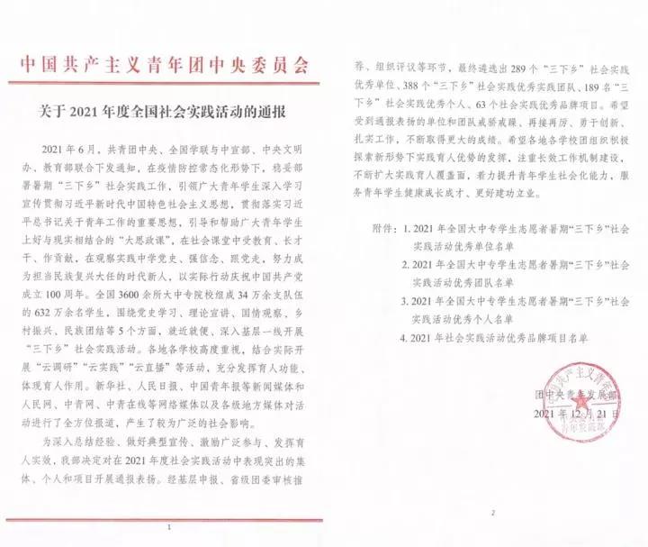 本站訊(編輯 楊夢(mèng)媛 責(zé)任編輯 朱誠)日前,共青團(tuán)中央對(duì)在2021年全國大中專學(xué)生志愿者暑期“三下鄉(xiāng)”社會(huì)實(shí)踐活動(dòng)中表現(xiàn)突出的集體和個(gè)人予以表彰。天津音樂學(xué)院赴新疆和田實(shí)習(xí)支教團(tuán)獲2021年全國大中專學(xué)生志愿者暑期“三下鄉(xiāng)”社會(huì)實(shí)踐活動(dòng)優(yōu)秀團(tuán)隊(duì)。此次獲評(píng)是繼2018、2019、2020年獲全國“三下鄉(xiāng)”優(yōu)秀團(tuán)隊(duì)、優(yōu)秀個(gè)人、優(yōu)秀單位“大滿貫”榮譽(yù)后,再次獲得全國“三下鄉(xiāng)”優(yōu)秀團(tuán)隊(duì)稱號(hào)。