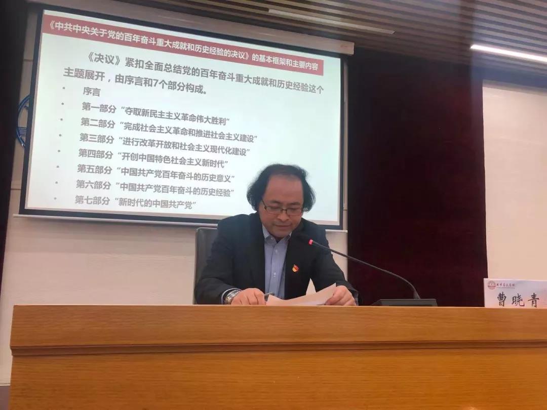 宣講由教務(wù)處處長(zhǎng)李小科主持。曹曉青從“深刻認(rèn)識(shí)總結(jié)黨的百年奮斗重大成就和歷史經(jīng)驗(yàn)的重大意義”“深刻認(rèn)識(shí)黨的百年奮斗的初心使命和重大成就”“深刻認(rèn)識(shí)中國(guó)特色社會(huì)主義新時(shí)代的歷史性成就和歷史性變革”“深刻認(rèn)識(shí)黨的百年奮斗的歷史意義和歷史經(jīng)驗(yàn)”“深刻認(rèn)識(shí)以史為鑒、開(kāi)創(chuàng)未來(lái)的重要要求”“從黨的百年奮斗歷程中汲取智慧和力量”等六個(gè)方面深刻闡釋了十九屆六中全會(huì)的重要?dú)v史意義和深刻思想內(nèi)涵。