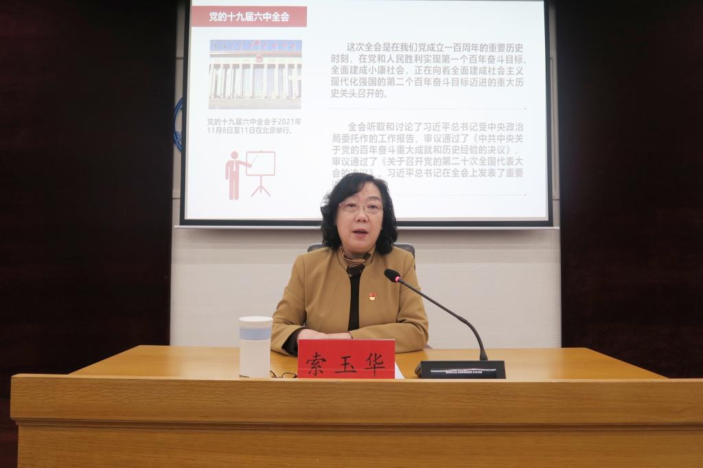 勿忘昨天的苦難輝煌,無愧今天的使命擔當,不負明天的偉大夢想。索玉華指出,黨的十九屆六中全會是在中國共產黨成立100周年的重要歷史時刻,在黨和人民勝利實現第一個百年奮斗目標、全面建成小康社會,正向著全面建設社會主義現代化強國的第二個百年奮斗目標邁進的重大歷史關頭召開的一次重要會議。全會審議通過的《中共中央關于黨的百年奮斗重大成就和歷史經驗的決議》,是一篇具有極強歷史穿透力、思想引領力、政治動員力、時代感召力的光輝的馬克思主義綱領性文獻,是新時代中國共產黨人牢記初心使命、堅持和發展中國特色社會主義的政治宣言,是以史為鑒、開創未來、實現中華民族偉大復興的行動指南,對推動全黨進一步統一思想、統一意志、統一行動,團結帶領全國各族人民奪取新時代中國特色社會主義新的偉大勝利,具有重大現實意義和深遠歷史意義。