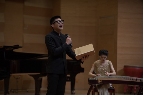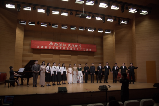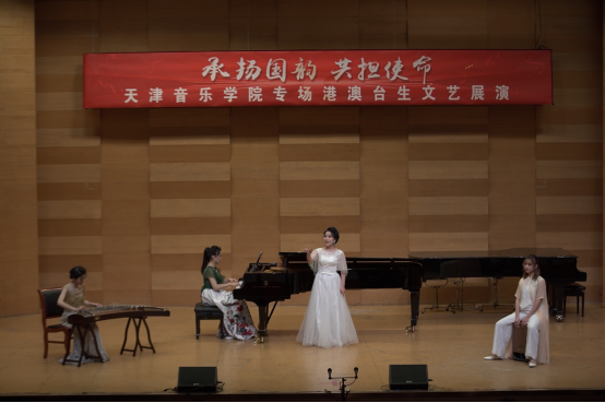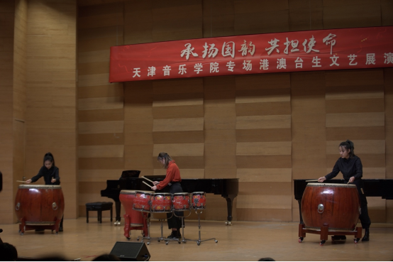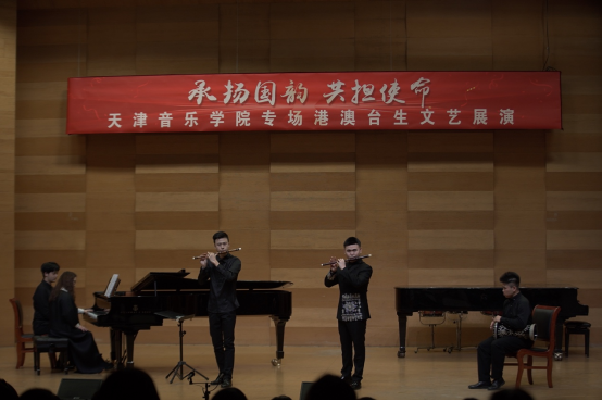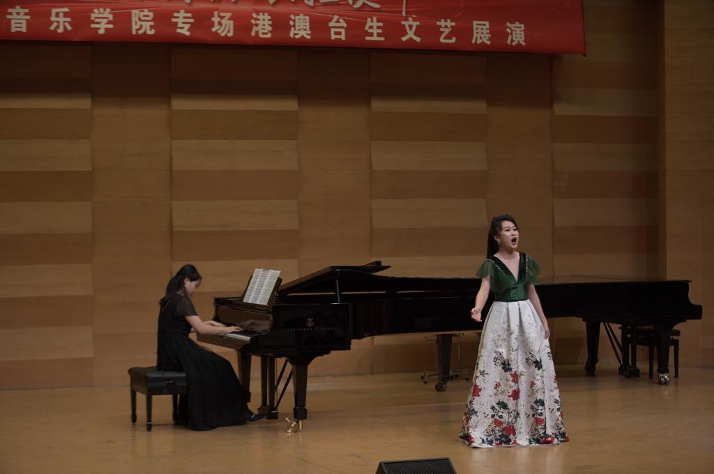 本場文藝展演由我院全體港澳臺學生聯合內地師生共同獻藝,表演的作品既有中國古典音樂、民族音樂的經典作品,也有由港澳臺學生攜手原創并演奏的曲目。展演由澳門學生張佳瑤與民樂系學生共同演奏鼓樂合奏《龍騰虎躍》開場,熱烈歡騰的鼓聲拉開了展演的序幕。由我院港澳學生與內地學生聯手創編并表演的《箏鼓吟》,不僅詮釋了學生獨特的藝術構想,還彰顯了兩岸三地學生文化同源的深厚根基。戲劇影視系香港學生李俊澤用粵語朗誦了李白的《將進酒》,我院聲樂系教師苑璐帶領香港學生鐘健豪深情演唱了《鄉愁》。臺灣學生劉記維與民樂系教師李樂、苑藝萍共同演奏了竹笛二重奏《胡旋舞》,該作品參加了第七屆文華獎“暨全國青少年民族樂器教育教學成果展示活動”的入圍展演。此外,香港學生梁藝賢和莊思情還先后表演了古箏獨奏《曉霧》,歌曲《七月的草原》等作品。展演末尾,和著鋼琴系教師張佳的傾情伴奏,全體港澳臺生與聲樂系學生共同演唱了《我和我的祖國》,文藝展演在熱烈的氣氛中結束。