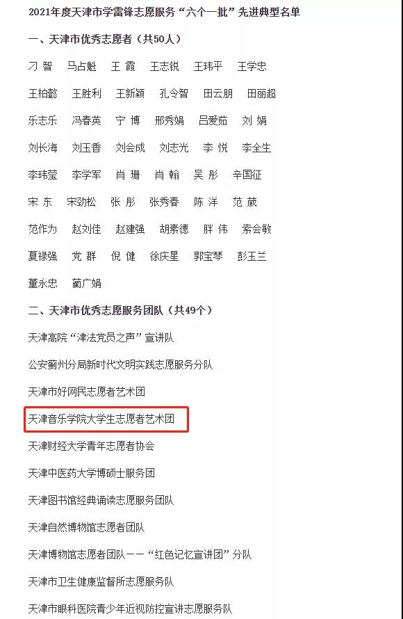 本站訊(編輯 李彤 責任編輯 趙霞)日前,天津市公布2021年度學雷鋒志愿服務“六個一批”先進典型名單。其中,天津音樂學院大學生志愿者藝術團獲評2021年度天津市優秀志愿服務團隊。