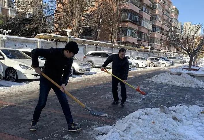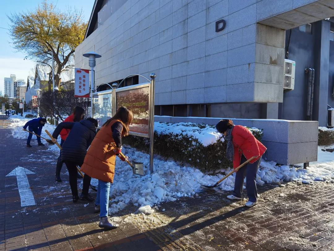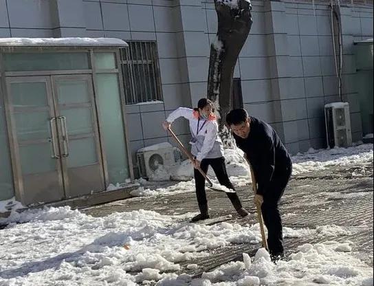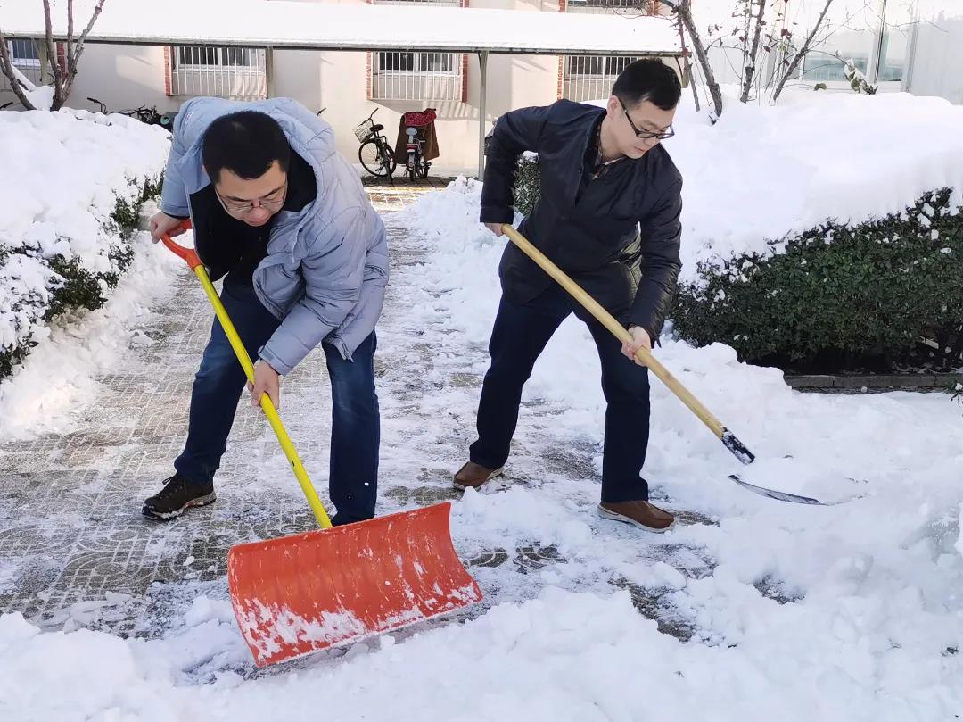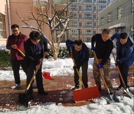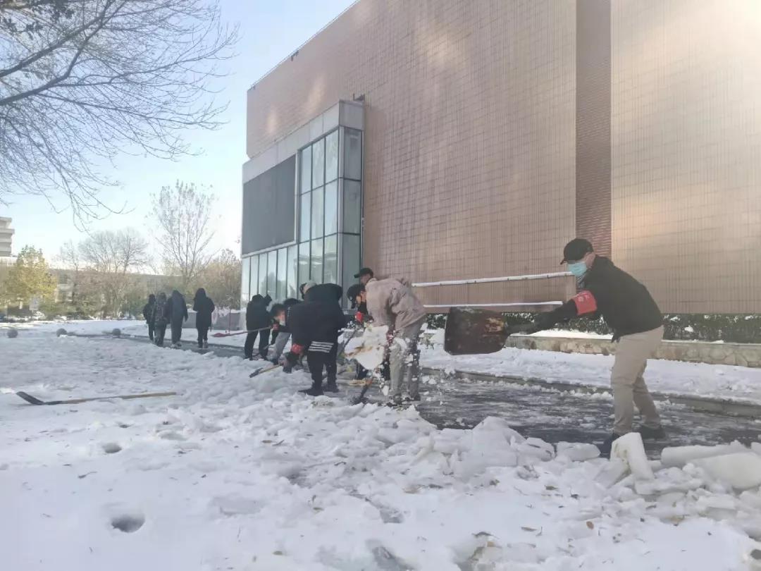 校園道路上的積雪被來(lái)往車輛和行人壓實(shí),冰雪結(jié)在路面上,十分光滑,不易清理。院領(lǐng)導(dǎo)帶頭在校園內(nèi)清雪,從辦公樓到停車場(chǎng)、食堂、宿舍、教室門前,全力為師生開(kāi)辟一條上班、上課的安全通行路線。