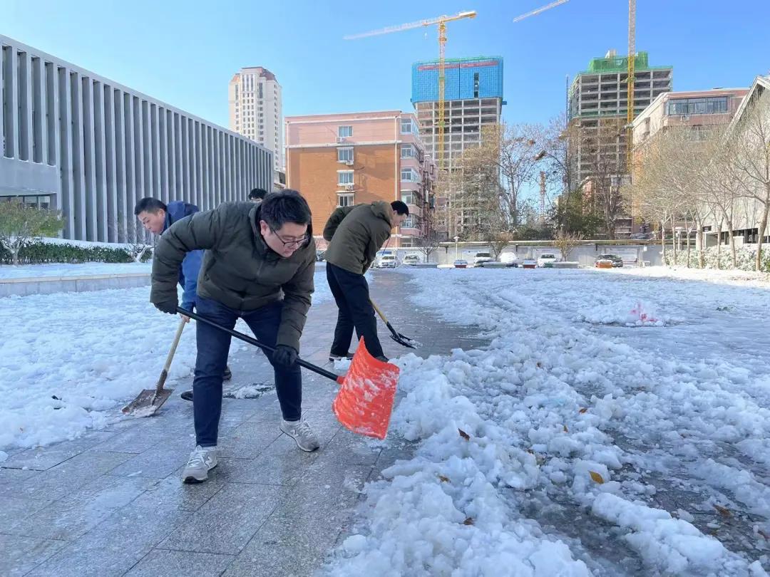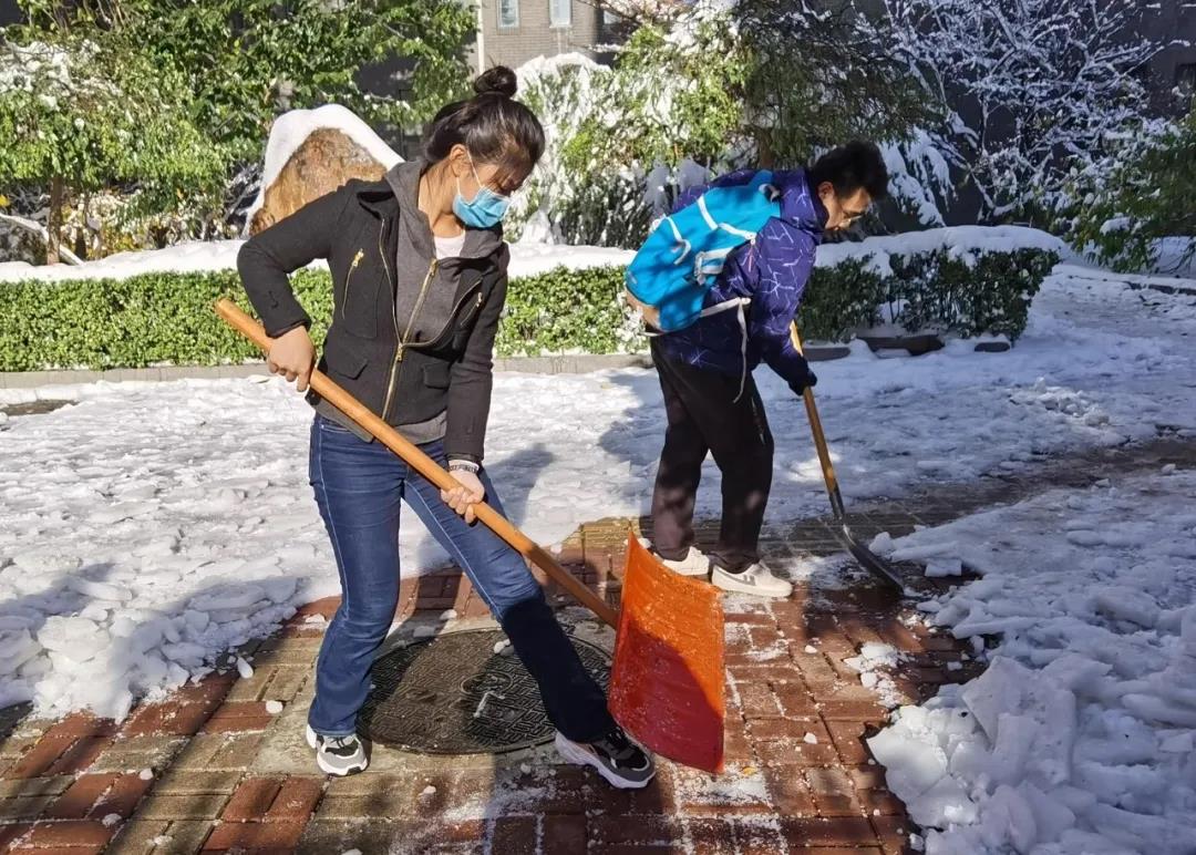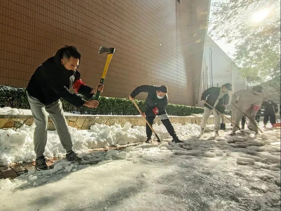 本站訊(編輯 李彤 責(zé)任編輯 趙霞)11月7日,今冬第一場(chǎng)雪翩躚而至,讓天音校園銀裝素裹的同時(shí),也給校內(nèi)交通和行人安全帶來(lái)影響。學(xué)院領(lǐng)導(dǎo)、黨員干部、師生志愿者以及保安、物業(yè)人員自發(fā)拿起鐵锨、雪推、掃帚,清掃路面的堅(jiān)冰積雪,全力保障師生出行安全。