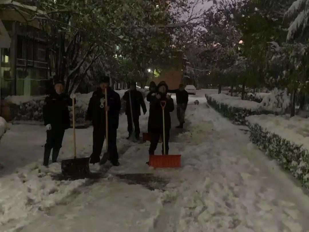 降雪以來(lái),天音“校園衛(wèi)士”頂風(fēng)冒雪,從白天到夜晚,堅(jiān)守崗位,為守護(hù)校園安全默默付出。7日下午,黨委書(shū)記索玉華第一時(shí)間趕到學(xué)校,與黨委副書(shū)記陳茉一同帶領(lǐng)安全工作部干部以及保安、物業(yè)人員等,冒著漫天大雪,率先開(kāi)始清掃學(xué)院南、北兩校區(qū)主要道路上的積雪。