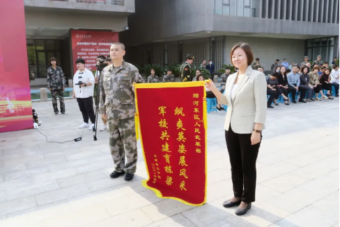 陳茉向河東區人民武裝部贈送錦旗“颯爽英姿展風采軍校共建育棟梁”。