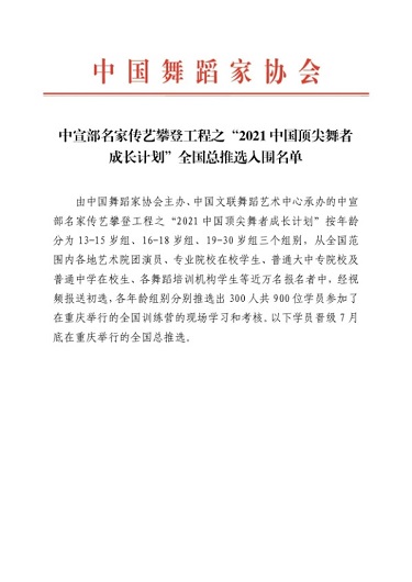 本站訊(編輯 吳少卿 攝影 頂尖舞者官網(wǎng)提供 責任編輯 羅亦南)近日,由中國舞蹈家協(xié)會主辦、中國舞蹈藝術中心承辦的中宣部名家傳藝攀登工程之推選工作初選結束,天津音樂學院舞蹈系2019級本科生劉國棟入圍“2021中國頂尖舞者成長計劃”,晉級7月底在重慶舉行的全國總推選。