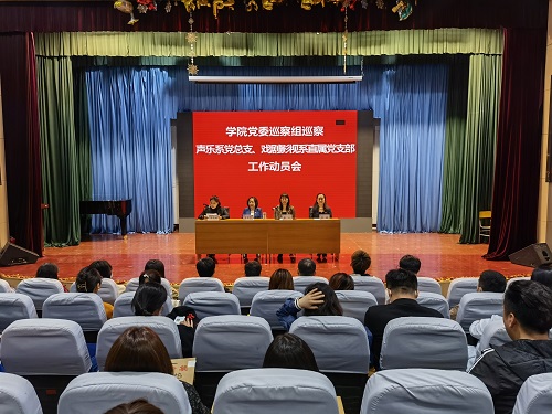 本站訊(編輯 薛璐璐 攝影 石峰 責任編輯 吳茜、齊崇玲)根據學院黨委部署安排,4月26日,學院黨委巡察組巡察聲樂系黨總支和戲劇影視系直屬黨支部工作動員會在南院E座多功能廳召開。黨委書記、巡察工作領導小組組長索玉華,黨委巡察工作辦公室主任、巡察組組長曹玲出席會議并講話。巡察組其他成員,聲樂系和戲劇影視系全體在職教職工、學生黨員代表參加會議。會議由戲劇影視系直屬黨支部書記齊崇玲主持。