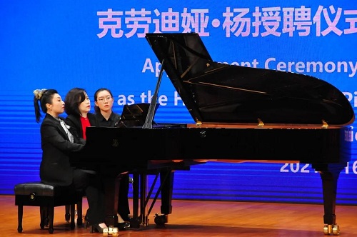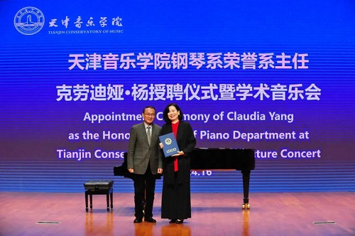 本站訊(編輯 李彤 責任編輯 趙霞 攝影 姜萌)4月16日,天津音樂學院舉辦專家授聘儀式,聘任著名馬來西亞華裔鋼琴家克勞迪婭·楊女士為鋼琴系榮譽系主任。院長徐昌俊為克勞迪婭·楊女士頒發聘書。奧地利駐華大使石迪福博士,駐華大使館文化參贊滿昊宸及夫人,我院黨委書記索玉華、黨委副書記董洪霞出席儀式。人事處、國際交流中心、黨政辦公室等相關部門負責同志和鋼琴系黨政領導,我院師生代表等參加儀式。