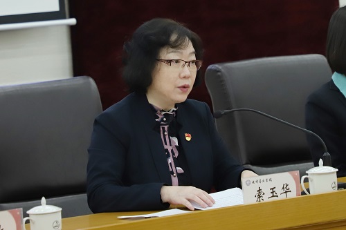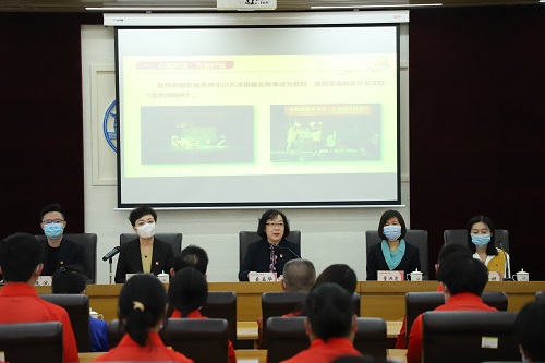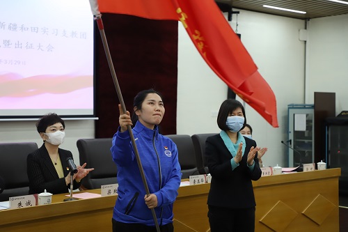 董洪霞向天津音樂學(xué)院赴新疆和田實(shí)習(xí)支教團(tuán)授旗。