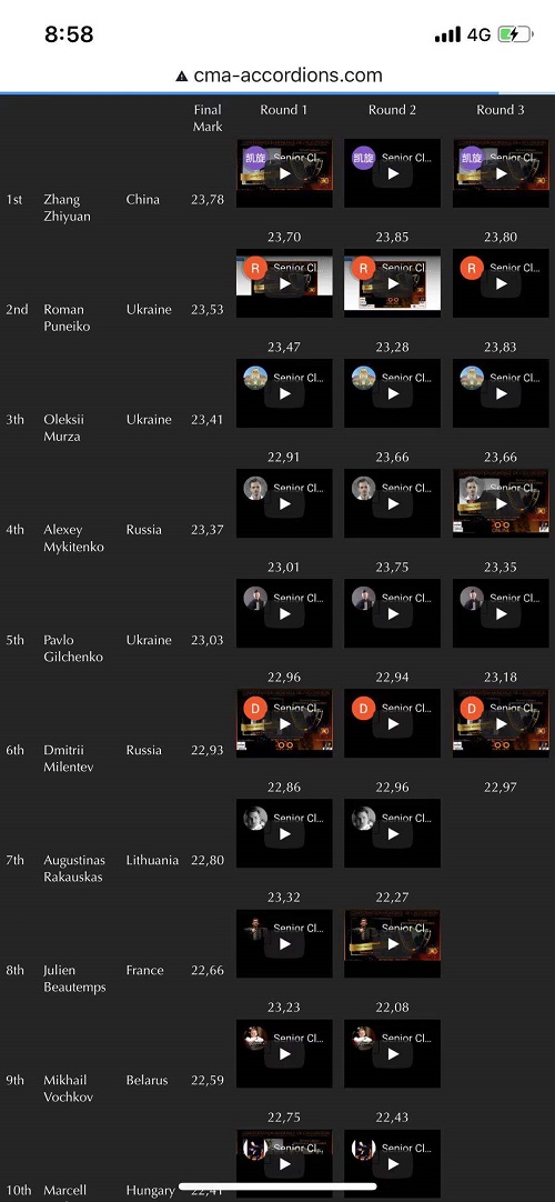 手風琴世界錦標賽是歷史最悠久的國際著名賽事之一,該組共設三輪賽制。張之遠同學在競爭激烈的決賽中演奏了由著名作曲家、天津音樂學院院長徐昌俊于2019年為手風琴創作的獨奏作品《兩首前奏曲》,在世界手風琴頂級賽事中再次展現了中國手風琴原創作品的藝術魅力,并最終憑借出色的發揮力壓群雄,以23.78分(滿分25分)奪得演奏家組第一名!