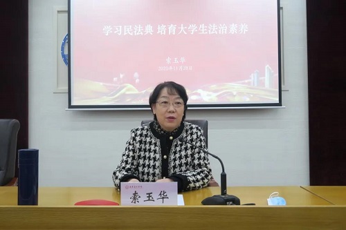 講座中,索玉華指出,《民法典》是新中國成立以來第一部以“法典”命名的法律,是新時代社會主義法治建設(shè)的重大成果,是在中國特色社會主義法律體系中具有重要地位,是一部固根本、穩(wěn)預(yù)期、利長遠的基礎(chǔ)性法律。隨后,她系統(tǒng)闡述解讀了民法典編撰歷程、民法典頒布實施的重大意義、民法典的主要內(nèi)容和亮點等方面內(nèi)容。特別是結(jié)合民法典的內(nèi)容框架,從“四個回應(yīng)”與師生一起學(xué)習(xí)體會了民法典的中國特色、實踐特色、時代特色。