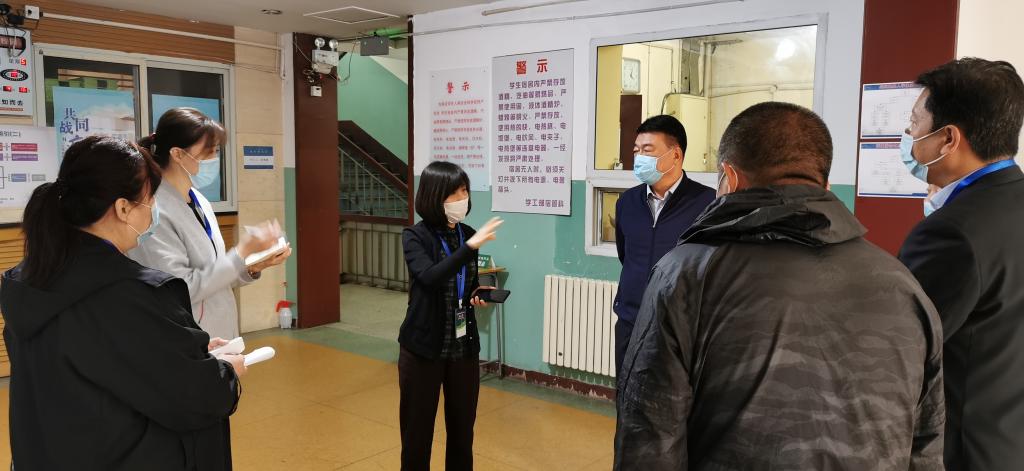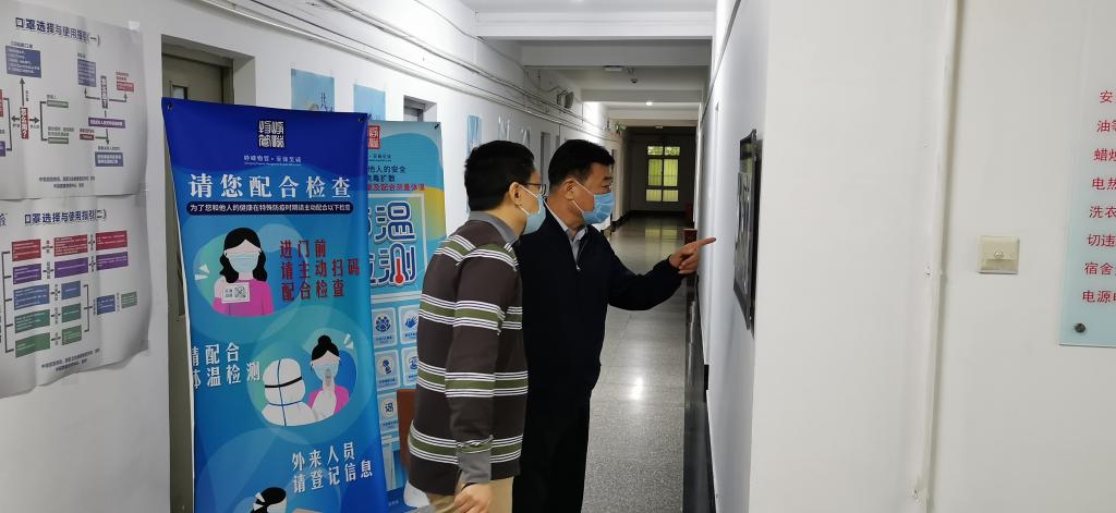 董洪霞、趙強一行先后檢查了北院宿舍區、返校畢業生接待登記區、南院宿舍區、學生餐廳等重要站點,并與宿舍管理人員及相關部門負責同志進行了充分溝通,詳細了解學生復課返校后的各項安排和具體舉措,對生活區的及教學區的管理和防控工作提出了要求。