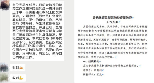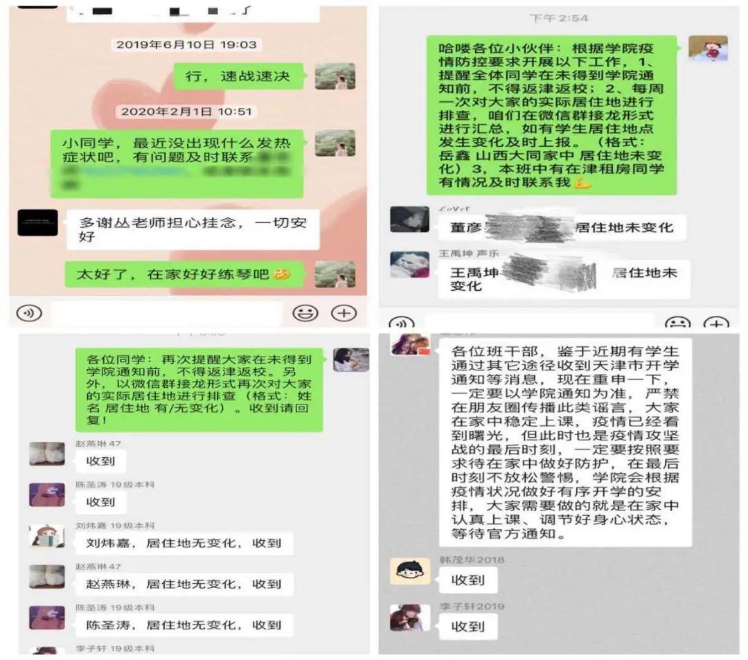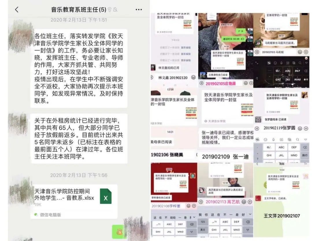 自疫情爆發(fā)以來,音樂教育系迅速針對全體師生開展排查工作,包括假期期間是否在津/家、周圍疫情情況、父母是否知情,系主任、教學(xué)秘書、輔導(dǎo)員、各位班干部、團(tuán)干部利用網(wǎng)絡(luò)媒體、班級微信群、打電話等多種途徑進(jìn)行調(diào)查。音樂教育系本科生和研究生共394人,無湖北籍學(xué)生,其中疫情期間未返回老家留津人員為9人,天津籍學(xué)生57人,其他學(xué)生均在家中。同時針對不在津教師,一對一進(jìn)行溝通,自基本情況掌握之后每日進(jìn)行疫情狀況“日報告、零報告”確保每一位師生的身體健康。“在全局上謀劃,在關(guān)鍵處落子。”排查中突出重點(diǎn),關(guān)注途徑湖北地區(qū)及留津?qū)W生。此次疫情爆發(fā)前期,通過排查,音樂教育系共有3名學(xué)生途經(jīng)湖北或和武漢人員有接觸,輔導(dǎo)員迅速進(jìn)行一對一溝通,通過微信進(jìn)行每日體溫和外出狀況的報送,告知家長和專業(yè)教師進(jìn)行聯(lián)合監(jiān)督,確保學(xué)生在疫情期間保持平穩(wěn)、健康的狀況。簽署家長告知書、承諾書,建立學(xué)校、家長對學(xué)生的雙層監(jiān)督。在學(xué)院下發(fā)簽署承諾書通知之前,音樂教育系就率先讓每一位家長和學(xué)生手寫簽署承諾書,讓家長和學(xué)生增強(qiáng)防控意識,認(rèn)識到此次疫情的重要性和緊迫性。為確保每一位學(xué)生基本情況的穩(wěn)定性,尤其是保證未返鄉(xiāng)學(xué)生的身體狀況,利用網(wǎng)絡(luò)平臺下發(fā)《致天津音樂學(xué)院學(xué)生家長及全體學(xué)生的一封信》,利用微信截圖方式確保每一位學(xué)生家長周知,傳達(dá)了疫情防控信心,告知家長進(jìn)行科學(xué)防控減少外出。