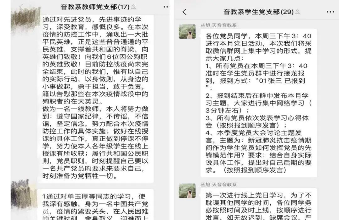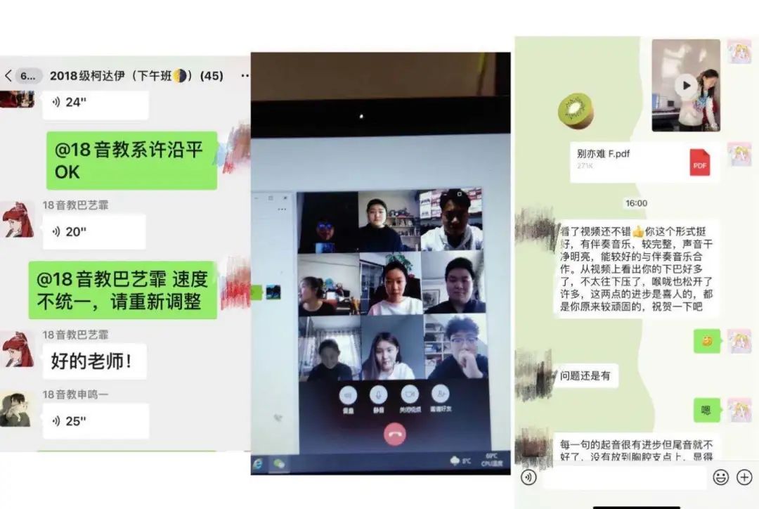 網(wǎng)絡(luò)授課階段,同時做好教學(xué)監(jiān)督管理工作。充分發(fā)揮雙導(dǎo)師作用,在督促學(xué)生學(xué)習(xí)時,關(guān)心學(xué)生的生活情況和心理健康。堅持意識形態(tài)研判、中心組學(xué)習(xí)、“三會一課”等不停步。充分利用學(xué)習(xí)強(qiáng)國、微信工作群等網(wǎng)絡(luò)手段進(jìn)行“云辦公”。無論身在哪里,音樂教育系全體教職工都本著認(rèn)真負(fù)責(zé)的態(tài)度,積極履行職責(zé),保證工作正常開展。