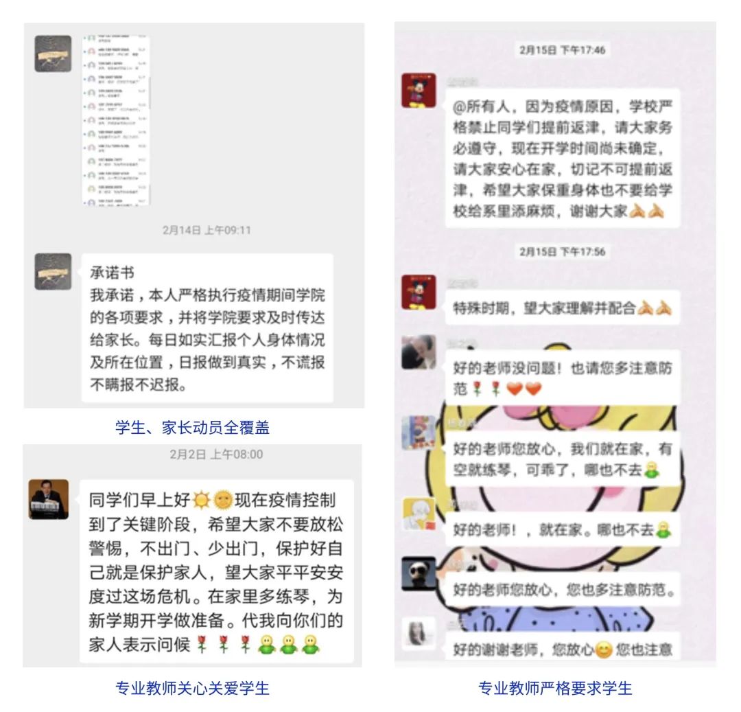 家長動員全覆蓋。在特殊時期,家長是協(xié)助學(xué)院加強對學(xué)生安全穩(wěn)定管理的重要依靠。在此期間,手風(fēng)琴鍵盤系與全體學(xué)生家長取得了聯(lián)系,將《致天津音樂學(xué)院學(xué)生家長及全體同學(xué)的一封信》與每位家長進行了溝通,一方面送去手風(fēng)琴鍵盤系對學(xué)生的關(guān)愛,同時尋求家長更大的支持和理解,形成管理合力。學(xué)生能夠嚴格執(zhí)行學(xué)院相關(guān)規(guī)定,狀況平穩(wěn)。