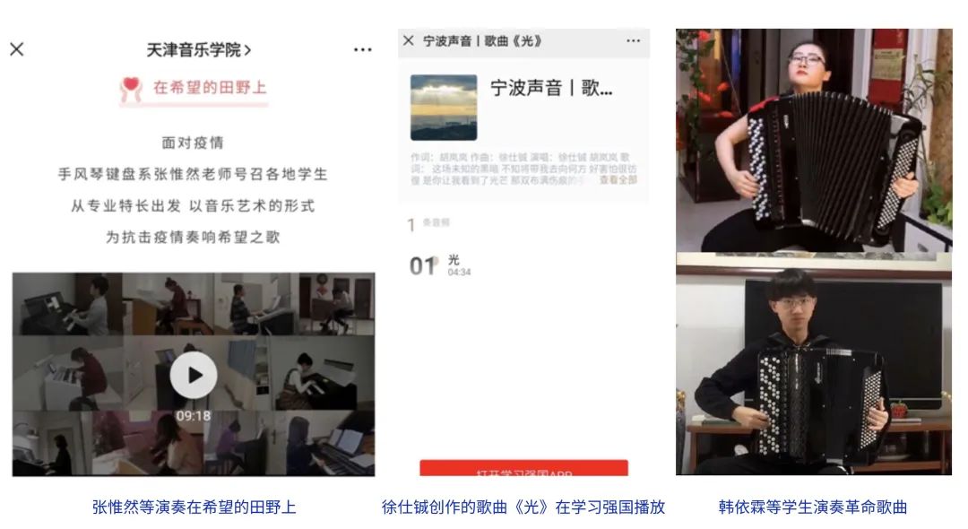 2017級手風(fēng)琴專業(yè)學(xué)生徐仕鋮創(chuàng)作了歌曲《光》并利用所學(xué)midi技能完成了配器編曲,歌曲《光》在學(xué)習(xí)強國播放。該曲展現(xiàn)了新一代年輕人對醫(yī)護人員的致敬和對美好生活的向往;韓依霖等手風(fēng)琴專業(yè)優(yōu)秀學(xué)生錄制了《歌唱祖國》等膾炙人口的革命歌曲,表達了對偉大祖國的熱愛。