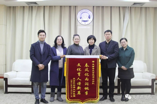 天津外國語大學校黨委副書記周紅蕾為演出團隊送上錦旗