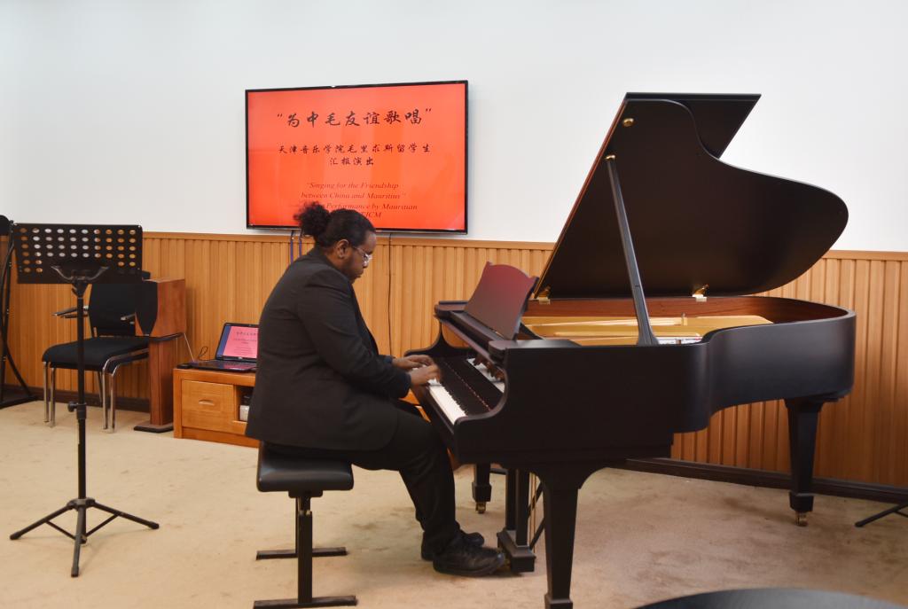 音樂會上,參加演出的毛里求斯籍留學生艾斯黛拉首先為大家帶來三首女聲獨唱《茉莉花》《我愛你塞北的雪》和《送別》,由聲樂系蘇凌翔老師伴奏。隨后,毛里求斯籍留學生文森特上臺為大家帶來一曲爵士鋼琴獨奏《她不可愛》。最后,由艾斯黛拉演唱、文森特伴奏,兩人唱響《我和我的祖國》,場內響起經久不息的掌聲,“中毛世代友好”的旋律在天津音樂學院久久回蕩。