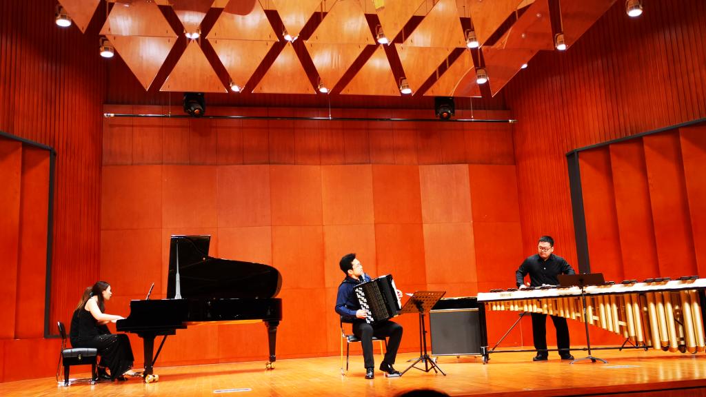 講座結束后,中央音樂學院青年教師許笑男、許歌卉和我院學生孔令達演奏了由徐昌俊院長作曲的手風琴、鋼琴、打擊樂三重奏版的《鳳點頭》,本場演奏是該版本的世界首演,三位青年演奏家配合默契、激情澎湃,將全場氣氛推向高潮。