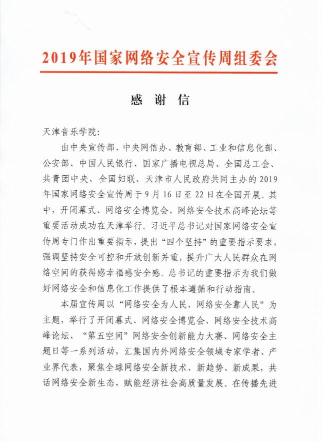 本站訊(編輯 李彤 責任編輯 趙霞 圖片來源 2019年國家網絡安全宣傳周組委會 津云)近日,2019年國家網絡安全宣傳周組委會發來感謝信,感謝我院對于2019年國家網絡安全宣傳周活動的成功舉辦做出的貢獻。