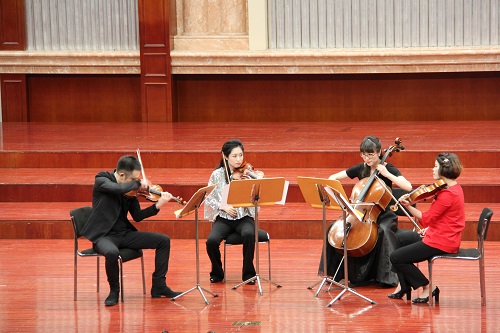 由付紅妹老師指導、劉奕凡指揮,附中初一年級的新生參演的童聲合唱《鈴兒響叮當》和《歌聲與微笑》開啟了音樂會序幕。馬曉瑩、余行和史寧帶來了戲曲合奏《夜深沉》,京胡、古箏和打擊樂三樣樂器的組合,將戲曲的雋永韻味和民樂的精彩技巧聯合推出。王玨老師的鋼琴獨奏《阿根廷舞曲》三段,帶給大家異域風情與非凡律動,光彩依舊更添情趣。趙登輝老師帶來了《你玷污了我的靈魂》《一樣的聲音》兩曲,歌聲與中國音樂學院姜韜老師伴奏相得益彰,讓人陶醉于聲韻張弛和起伏。由管弦學科姜提、閻菁姝、羅璇三位老師特邀天津交響樂團王箏一同帶來的弦樂四重奏門德爾松《f小調第六弦樂四重奏》,旋律和聲重疊鋪墊充分,主題伴奏角色轉換自然,帶領大家徜徉在優雅、寧靜的古典音樂海洋。據悉,該組合技術水準和默契度一流,曾受到丹麥皇家音樂學院副院長Tim Frederiksen指導。