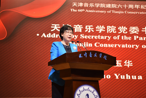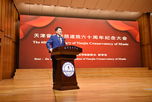 紀念大會由天津音樂學院副院長靳學東主持,黨委書記索玉華致辭,她代表天津音樂學院黨委、全體師生員工向出席大會的各位領導、各位嘉賓表示最熱烈的歡迎,向長期以來關心支持學院事業發展的社會各界表示最衷心的感謝,向為學院事業發展忠誠奉獻的老一輩天音人致以最崇高的敬意,向海內外天音人致以最誠摯的祝賀。大會在國歌聲中緩緩拉開帷幕,全體師生起立共同唱響國歌。
