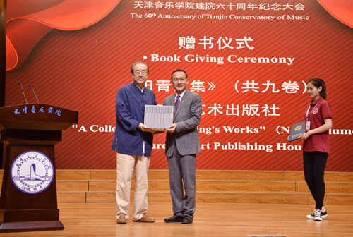 中央文史研究館館員、天津音樂學院1977屆校友田青作為校友代表發言,并向母校贈送《田青文集》(九卷本)。