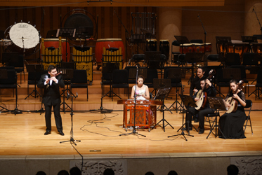 音樂會上半場是由我院優秀教師以不同形式演奏的六部作品,包括王展展的嗩吶獨奏《大笛絞》、王紅藝的柳琴獨奏《劍器》、趙元春的胡琴四重奏《弓弦舞》、蔣寧的笛子獨奏《胡璇舞》、楊紅、丁夢迪、郭佳萱的古箏三重奏《炎》、凡音組合的民族器樂重奏《德音》。