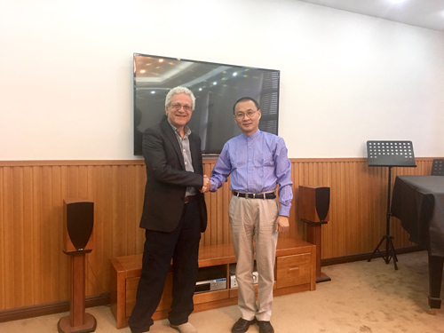 徐昌俊院長(zhǎng)首先代表天津音樂學(xué)院對(duì)英國約克大學(xué)兩位專家的到訪表示歡迎。徐院長(zhǎng)表示,英國約克大學(xué)一直以來都是天津音樂學(xué)院的重要合作伙伴,兩校之間一直保持密切的聯(lián)系。本次英國約克大學(xué)科研部主任托馬斯·司馬庫教授到訪我院,雙方就進(jìn)行作曲專業(yè)的博士生聯(lián)合培養(yǎng)交換了意見,并就兩校聯(lián)合舉辦作曲系教師新作品音樂會(huì)事宜進(jìn)行深入交流。最后,徐院長(zhǎng)向兩位教授贈(zèng)送了禮品,并預(yù)祝他們的大師班和音樂會(huì)圓滿成功。