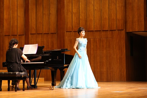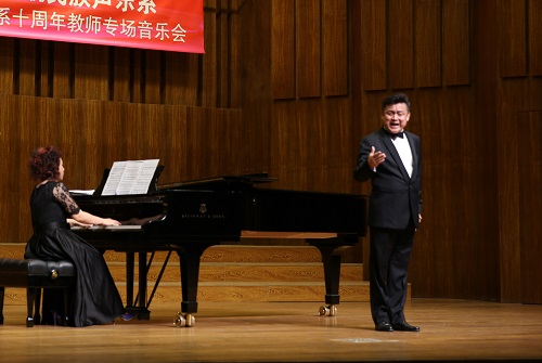 音樂會開場,青年教師王乙婷、徐宏瑾分別演唱了歌劇《原野》選段《啊,我的虎子哥》、根據(jù)滬劇改編的歌曲《燕燕說媒》、創(chuàng)作歌曲《鳥兒在風(fēng)中歌唱》和創(chuàng)作歌曲《知己紅顏》、河北民歌《扎風(fēng)箏》及《幽蘭操》。兩位老師的演唱如泣如訴,觀眾聽得如癡如醉。隨后,李清資副教授、劉雅麗教授、青年教師楊倩分別為大家演唱了藝術(shù)歌曲《懷念曲》、創(chuàng)作歌曲《我愛你,中國》,京劇《梨花頌》和藝術(shù)歌曲《點絳唇?賦登樓》、山西民歌《繡荷包》、歌劇《木蘭詩篇》的選段《我的愛將與你相伴終生》及音樂劇《星》的選段《輕輕推開一扇窗》、創(chuàng)作歌曲《昭君》。三位老師的演唱風(fēng)格迥異、聲情并茂、情感細膩,感染者現(xiàn)場的每一個觀眾。最后,民族聲樂系主任趙振嶺教授演唱了八十年代他為電視風(fēng)光片《北戴河之夢》演唱的由著名作曲家鮑元愷創(chuàng)作的主題歌《藍色的夢》、創(chuàng)作歌曲《為你歌唱》和《草原上升起不落的太陽》,他的演唱將音樂會推向了高潮。整場音樂會由民族聲樂系藝術(shù)指導(dǎo)教研室主任徐玲老師、聲樂系藝術(shù)指導(dǎo)教研室主任蘇凌翔老師、鄭鞏洋副教授和青年教師趙雪竹擔(dān)任鋼琴藝術(shù)指導(dǎo)。