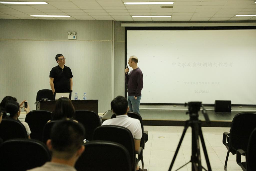 最后郝維亞教授通過自己的歌劇作品《大漢蘇武》第三幕“蘇武的詠嘆調(diào)和索仁娜詠嘆調(diào)”,從“根據(jù)語言不同來劃分歌劇的種類”、“‘語言’是歌劇‘音樂’創(chuàng)作的核心”以及“歌劇中中文和西方語言的差異”等方面,具體分析了“語言問題和宣敘調(diào)的處理方式”、“如何通過音樂來表現(xiàn)戲劇人物和塑造人物形象”的問題。郝維亞教授和作曲系的師生分享了自己對于歌劇寫作的體會,并指出歌劇創(chuàng)作中所有技術手段都應以戲劇語言需要為前提。整場講座同學積極與郝維亞教授進行互動交流,以輕松活躍的氣氛落下帷幕。
