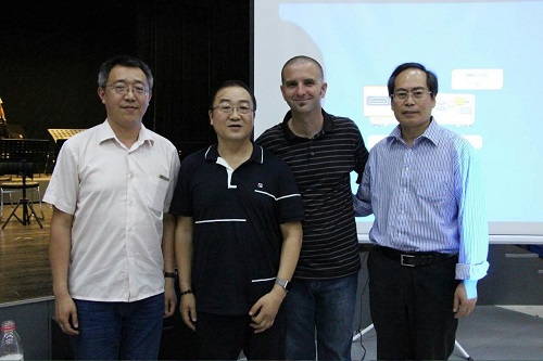 本站訊(通訊員 唐鵬 攝影 法智)5月18日下午,在現代音樂廳,美國密蘇里大學堪薩斯學校與舞蹈學院爵士樂研究副主任丹·托馬斯(美)舉辦了關于《美國爵士樂發展史及流派》專題講座。我院副院長方建軍教授出席了本次活動,現代音樂系主任劉柱喜教授擔任本次講座的主持人,講座由英語教研室主任孔維鋒副教授擔任翻譯。