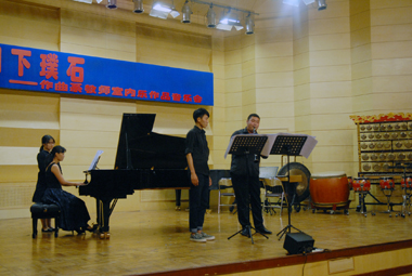 上半場(chǎng)的開(kāi)場(chǎng)作品是由梁文曦老師為古箏,黑管,大提琴而作的《月下璞石》,是“北京現(xiàn)代音樂(lè)節(jié)211室內(nèi)樂(lè)精品工程”的委約作品,作者希望通過(guò)樂(lè)器在各自音響上細(xì)致,細(xì)膩的演奏,展示出淡淡月光下的天然璞石之美,給人以豐富的想象力。劉音彤老師的作品《靜態(tài)》模擬王維的五言詩(shī)《竹里館》的吟誦聲調(diào)設(shè)計(jì)出四個(gè)旋律線條,共四個(gè)樂(lè)章,各樂(lè)章沒(méi)有動(dòng)力發(fā)展,更沒(méi)有高潮點(diǎn)的設(shè)定,都是幫助作者避免情感表達(dá)的重要手段,各樂(lè)器繁復(fù)的局部運(yùn)動(dòng)塑造出四種靜止的色彩性音響圖形。盧長(zhǎng)劍老師《為小提琴與鋼琴而作的兩首作品》使用小提琴與鋼琴之間不同的關(guān)系,第一首中,鋼琴演奏的內(nèi)容運(yùn)用較系統(tǒng)性的手法創(chuàng)作,同時(shí)小提琴的內(nèi)容具有裝飾性,很自由;而第二首作品中角色互換,小提琴系統(tǒng)性,鋼琴較自由。楊愷老師的為打擊樂(lè)、預(yù)置人聲與電子音樂(lè)而作的《腰鼓,2014》,以打擊樂(lè)為基礎(chǔ)并結(jié)合采樣人聲,同時(shí)使用電子手段對(duì)他們進(jìn)行再加工。通過(guò)這樣的方式讓欣賞者感受傳統(tǒng)與現(xiàn)代結(jié)合所帶來(lái)的新的音樂(lè)體驗(yàn)。徐學(xué)吉老師的單簧管協(xié)奏曲《三闕》以三個(gè)時(shí)態(tài)為視角,創(chuàng)作出“遙”、“謠”、“搖”三個(gè)樂(lè)章,透視了“y?o”字所賦予的精神內(nèi)涵。