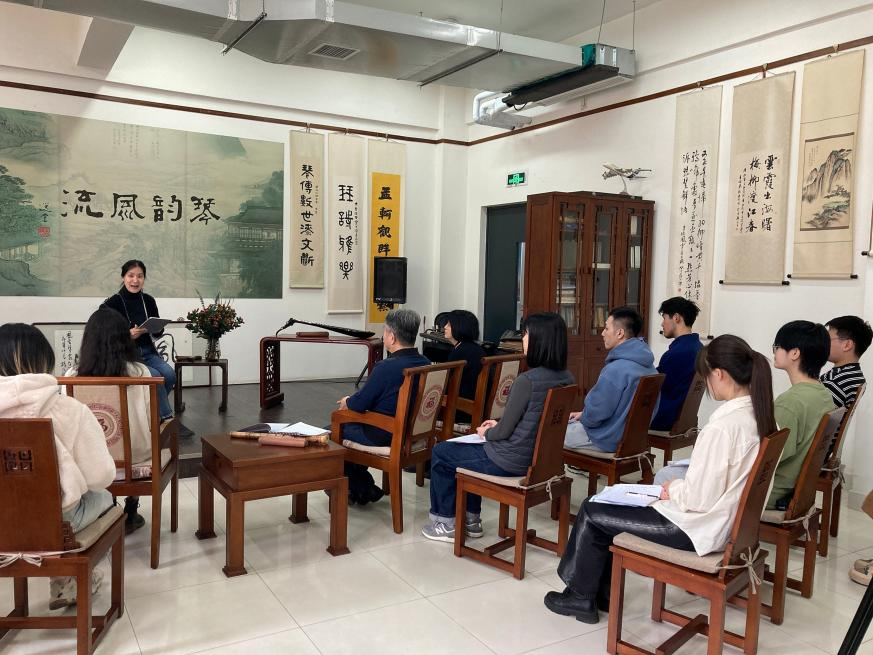活動中,雅藝老師首先對福建南音作出簡要介紹。中國音樂之中,以南音為最古。“福建南音”也稱“南音”“泉州南音”“弦管”,主要流行于福建省閩南地區,發源于福建泉州,用閩南語演唱,被譽為“中國音樂史上的活化石”。其后,雅藝老師講解了《清風頌》和《起手板》之【綿答絮】兩首曲目,并帶領大家一起拍板、唱譜,使同學們在實踐和體驗中了解到“晉唐遺音”的咬字吐詞、歸韻收音,以及獨特的記譜方式和表演形式,讓同學們深刻地感受到了福建南音的獨特魅力。