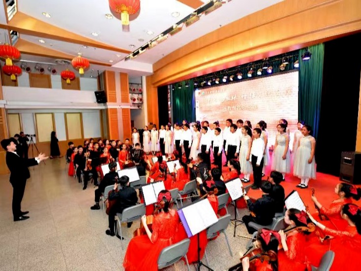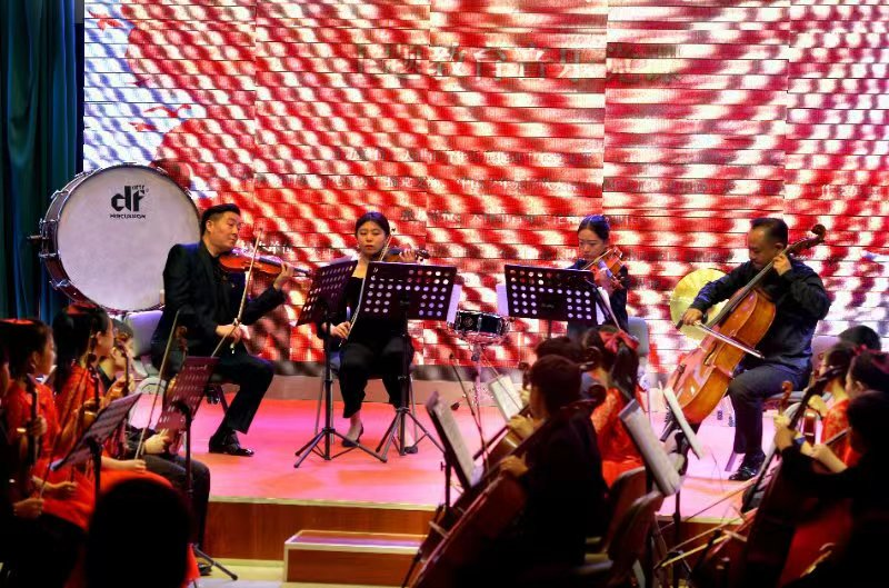 伴隨著悠揚(yáng)婉轉(zhuǎn)的旋律,一場別開生面的音樂主題黨課在合唱團(tuán)《我們一起遠(yuǎn)航》中拉開了帷幕。本次音樂黨課采用“以史串曲,以曲敘史”講、演結(jié)合的方式,以合唱、器樂重奏、配器朗誦、混聲合唱、管弦樂等演奏的形式開展,帶領(lǐng)黨員們重溫歷史,在音樂中觸摸信仰的力量,在音樂中增強(qiáng)愛黨愛國情懷,拉近了黨員們與高雅藝術(shù)的距離。在演出中,演員們演奏了一首首弘揚(yáng)正能量的音樂作品,如紅色經(jīng)典曲目《情深誼長》《唱支山歌給黨聽》《北京的金山上》《紅色的童謠》《我和我的祖國》《我愛你中國》《絨花》等,通過演員們的演奏展示出了恢弘激昂的氣勢,詮釋出滿腔的愛國熱情。