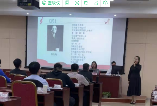 學員在《英雄贊歌》《紅星歌》等紅色經典影視歌曲中重溫歷史時刻,一起追憶抗戰歷史中的英雄人物;《春天的故事》、《走進新時代》、《在希望的田野上》等曲目體現出了改革開放以來,偉大的祖國勃勃生機、欣欣向榮的景象。通過30多首經典音、視頻素材,將音樂與黨史學習教育有機結合。講座還邀請優秀學生現場演唱,提升課堂感染力。講座在《沒有共產黨就沒有新中國》的歌聲中達到了教與學的高度互動,把課堂氣氛推向了高潮。