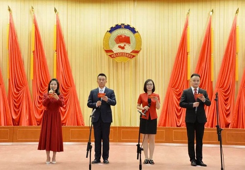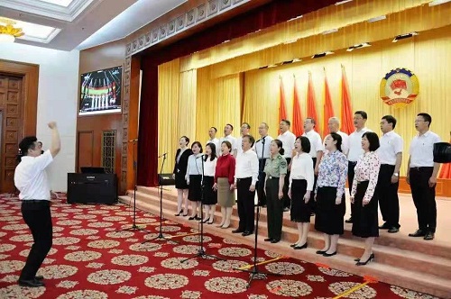 本站訊(編輯 王寧 責任編輯 梁玫)6月9日,市政協機關舉行“同唱一首歌,永遠跟黨走”慶祝中國共產黨成立100周年紅色經典歌曲傳唱大會。市領導與機關黨員干部、機關駐地社區黨員干部、駐勤武警官兵共同傳唱紅色經典歌曲,歌頌黨、歌頌祖國、歌頌人民、歌頌英雄,唱響堅定不移跟黨走的主旋律,發出擔當新使命、奮進新時代的最強音。市政協委員、民盟市委會委員、我院民族聲樂系李清資副教授作為市政協藝術團團長,擔任此次傳唱大會的藝術指導,并擔任《沒有共產黨就沒有新中國》《永遠跟黨走》兩首歌曲的合唱指揮。