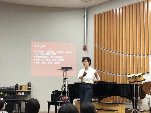 講座中,陳怡然從文字記載和樂器演奏音響的角度分析了中國(guó)古代樂器分類“八音”、西洋交響樂隊(duì)編制、世界民族樂器的分類原則,引出奧爾夫樂器分類;從奧爾夫教學(xué)理念角度解讀了奧爾夫的樂器特點(diǎn);從作品角度講解了奧爾夫樂隊(duì)編制建立;并針對(duì)不同年齡段,不同受教育群體給出了配置樂器的建議。聽眾在陳怡然的帶領(lǐng)下演奏、聆聽、總結(jié)奧爾夫樂器的特點(diǎn),挖掘音色,臺(tái)上臺(tái)下互動(dòng)頻繁,從教學(xué)方式上體現(xiàn)了奧爾夫教學(xué)體系的理念。