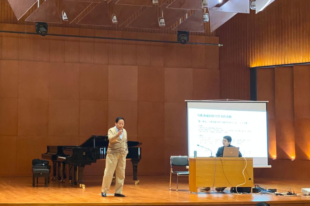 講座中,劉念劬教授向同學們介紹了如何為歌曲編配即興鋼琴伴奏,簡單闡述了即興鋼琴演奏的概論,著重指出在即興演奏的過程中,更為重要的是結構布局和調性布局,并且為在座的師生演奏了古今中外的主題聯奏,講述了布局、和聲、復調等技法的運用,同時也鼓勵同學們多聽,從大量的音樂中吸取即興演奏的素材。他指出,作為音樂家,要“向世界藝術經典致敬,向中國民族音樂致敬”;作為音樂文化的傳承者,要在傳承中創新,努力做到“讓經典音樂普及化,讓流行音樂殿堂化”。講座最后,劉念劬教授對同學們提出的“如何為中國調式的歌曲編配即興伴奏”、“如何創作構思和藝術表達“等學術問題進行悉心解答。