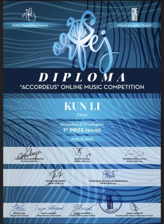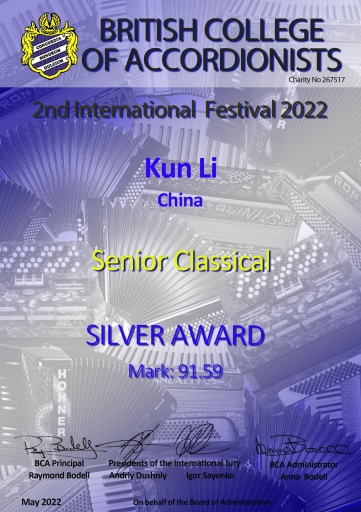 今年5月結束的2022第二屆英國國際手風琴比賽中,本科三年級學生李堃(指導老師:王樹生)獲得成年古典組銀獎。