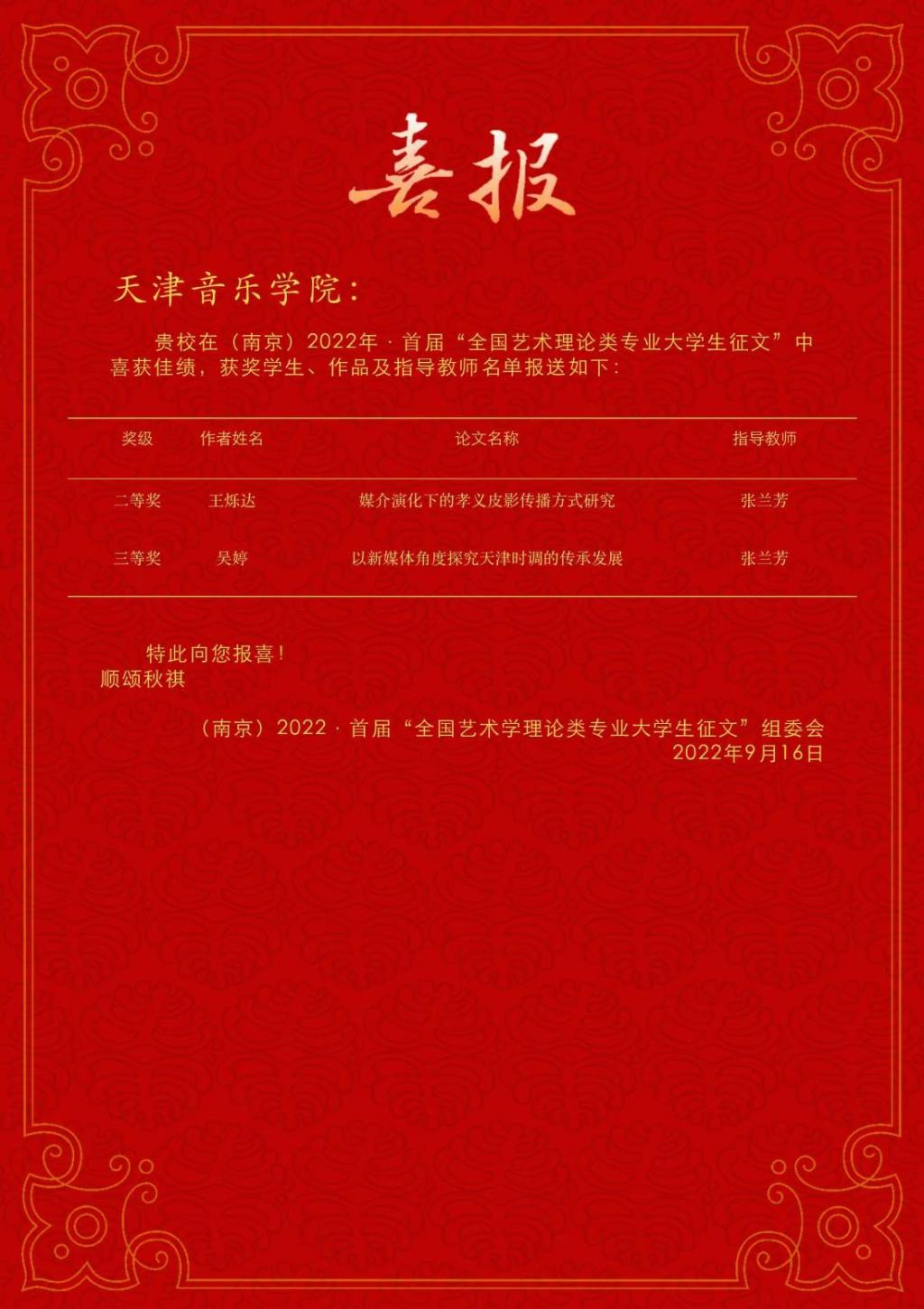 本站訊(編輯 張蘭芳 吳婷 王爍達 責任編輯 魏麗霞)近日,由中國藝術學理論學會支持,南京藝術學院主辦,上海戲劇學院創意學院、四川音樂學院藝術學理論與管理學院、西安美術學院美術史論系、廣西藝術學院人文學院、內蒙古藝術學院文化藝術管理學院聯合協辦的2022年·首屆“全國藝術理論類專業大學生征文”活動圓滿落下帷幕,藝術管理系教師張蘭芳指導學生王爍達、吳婷撰寫的論文《媒介演化下的孝義皮影傳播方式研究》《以新媒體角度探究天津時調的傳承發展》分別榮獲二等獎、三等獎。
