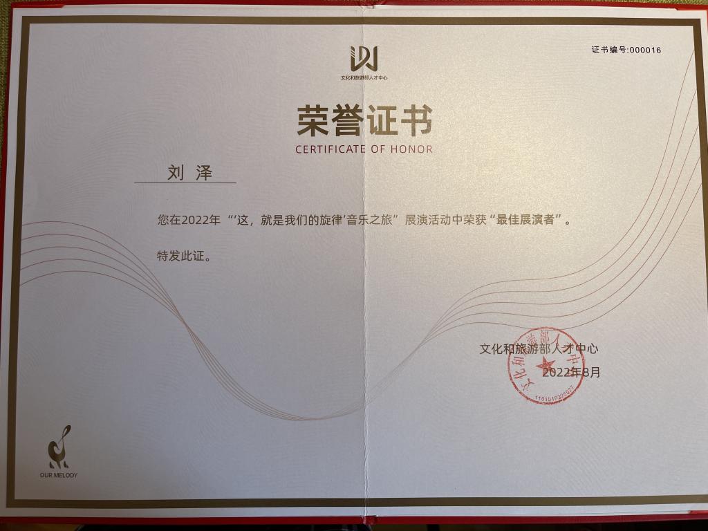 本站訊(編輯 郭偉強 責任編輯 王健英)日前,由文化和旅游部人才中心主辦的“‘這,就是我們的旋律’音樂之旅”展演活動順利結束。經過激烈的角逐,我院管弦系巴松專業(yè)碩士研究生劉澤同學獲得“最佳展演獎”(第一名)。
