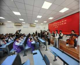 活動中,志愿者發(fā)揮專業(yè)所學(xué)為小學(xué)生們演奏了《戰(zhàn)馬奔騰》《巴赫無伴奏前奏曲》《草原小姐妹》《訴——讀唐詩<琵琶行>有感》《秦川情》《秦王破陣樂》《花好月圓》等經(jīng)典器樂作品,還用小學(xué)生易于接受的“童言童語”介紹了作品的創(chuàng)作背景以及二胡、琵琶、竹笛、大提琴的構(gòu)造、特點、音色,讓大家在美妙旋律中加深對中華傳統(tǒng)文化的認識,了解中國民族音樂風(fēng)格的多樣性。志愿者還用民族器樂演奏了《上春山》《孤勇者》等膾炙人口的流行歌曲,將現(xiàn)場氛圍推向高潮。