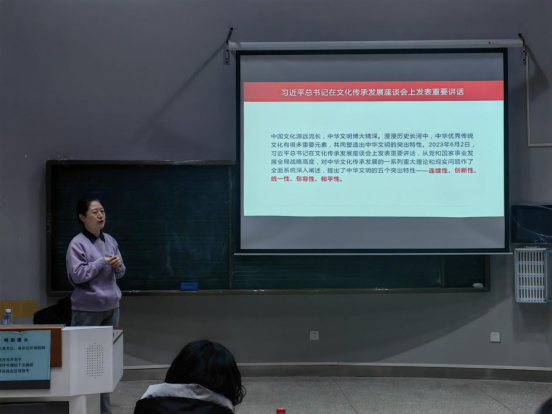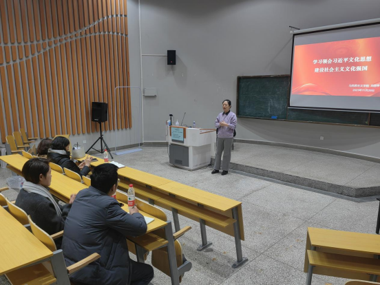 尚老師重點講述了習近平文化思想提出的時代背景,系統梳理了新中國成立以來我國文化建設的歷程與成就,傳達了全國宣傳思想文化工作會議精神,帶領大家深入領會“七個著力”內涵。尚老師用通俗易懂的語言、翔實生動的案例、深刻獨到的觀點談了對習近平文化思想的學習認識和深入體會。她表示,我們要深入學習貫徹習近平文化思想和習近平總書記對宣傳思想文化工作的一系列重要指示精神,同時對新時代高校教師如何主動踐行心使命,推進課程思政高質量發展提出了建議。