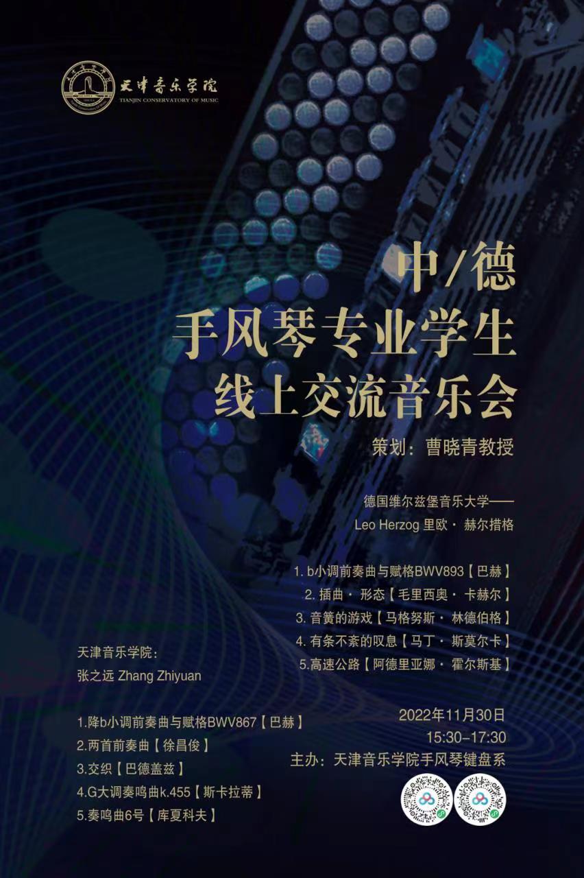 本站訊(編輯 張雅萱 責任編輯 孫青 孟輝)11月30日,“中德手風琴專業學生線上交流音樂會”成功舉辦。本場音樂會由天津音樂學院副院長曹曉青教授策劃,手風琴鍵盤系主辦。參加演出的兩位同學分別是來自德國維爾茨堡音樂學院的Leo Herzog 里歐· 赫爾措格和天津音樂學院的張之遠。音樂會中演奏的曲目難度大,專業性強,風格多樣,顯示出很高的藝術水準。本次活動為兩校師生搭建了專業教學與表演實踐的交流平臺,也是我校手風琴專業加強國際交流與合作的重要學術活動。