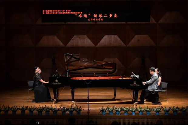 天津音樂學院“卓越”鋼琴二重奏正式成立于2020年,由鋼琴系兩位杰出的中青年鋼琴家劉昭智與楊詣創建組成,旨在通過教學、科研、演出、創作等多方位推廣、普及鋼琴四手聯彈與雙鋼琴音樂藝術。“卓越”鋼琴二重奏的兩位演奏家自合作以來,已成功參演過多場具有紀念意義的音樂會演出活動。本場音樂會,兩位演奏家先后演奏了鮑元愷作曲、梁爽改編的《炎黃風情》經典選曲六首與拉赫瑪尼諾夫作曲的g小調第一雙鋼琴組曲Op.5《音畫幻想曲》以及貝多芬作曲、沙爾文卡改編的c小調第五交響曲“命運”Op.67。濃郁的民族民間音樂風情、富有浪漫主義的夢幻色彩與情感涌動、鼓舞人心的不屈不撓革命精神,在兩位演奏家的指尖中盡情地流淌與充分地展現,技術與情感在此刻得到了雙重碰撞,觸及靈魂深處的音樂感染了在場的所有聽眾。在熱烈的掌聲中,兩位演奏家加演了儲望華改編的《臺灣謠》,動情的旋律與熾熱的情感向聽眾傾訴著濃厚的家國情懷,令聽眾再次動容。